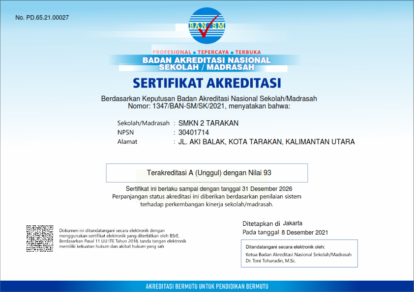 Pada Tahun 2020 SMK Negeri 2 Tarakan mengalami transformasi signifikan melalui program center of excellent (CEO), Tahun 2021 SMK Pusat Keunggulan (SMK PK), Tahun 2022 SMK Pemadanan dengan Industri dan Tahun 2025 SMK dengan pengajaran berbasis pabrik (Teaching Factory) skema Kolaborasi.